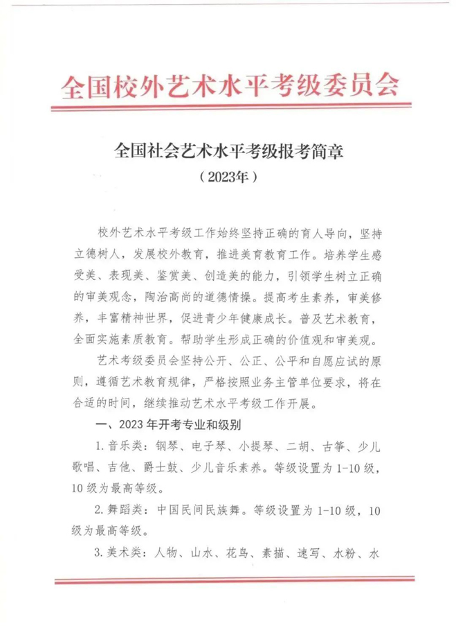 全国校外艺术水平考级委员会开考艺术门类,一级专业4个。