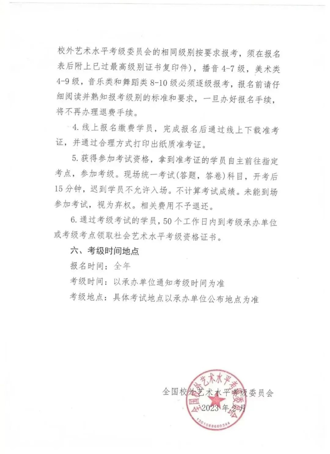 考级委员会对考级作品有展览、研究、摄影、录像、出版、宣传及处理权,概不退还。各考级项目考试要求,以报考科目的书面要求为准。